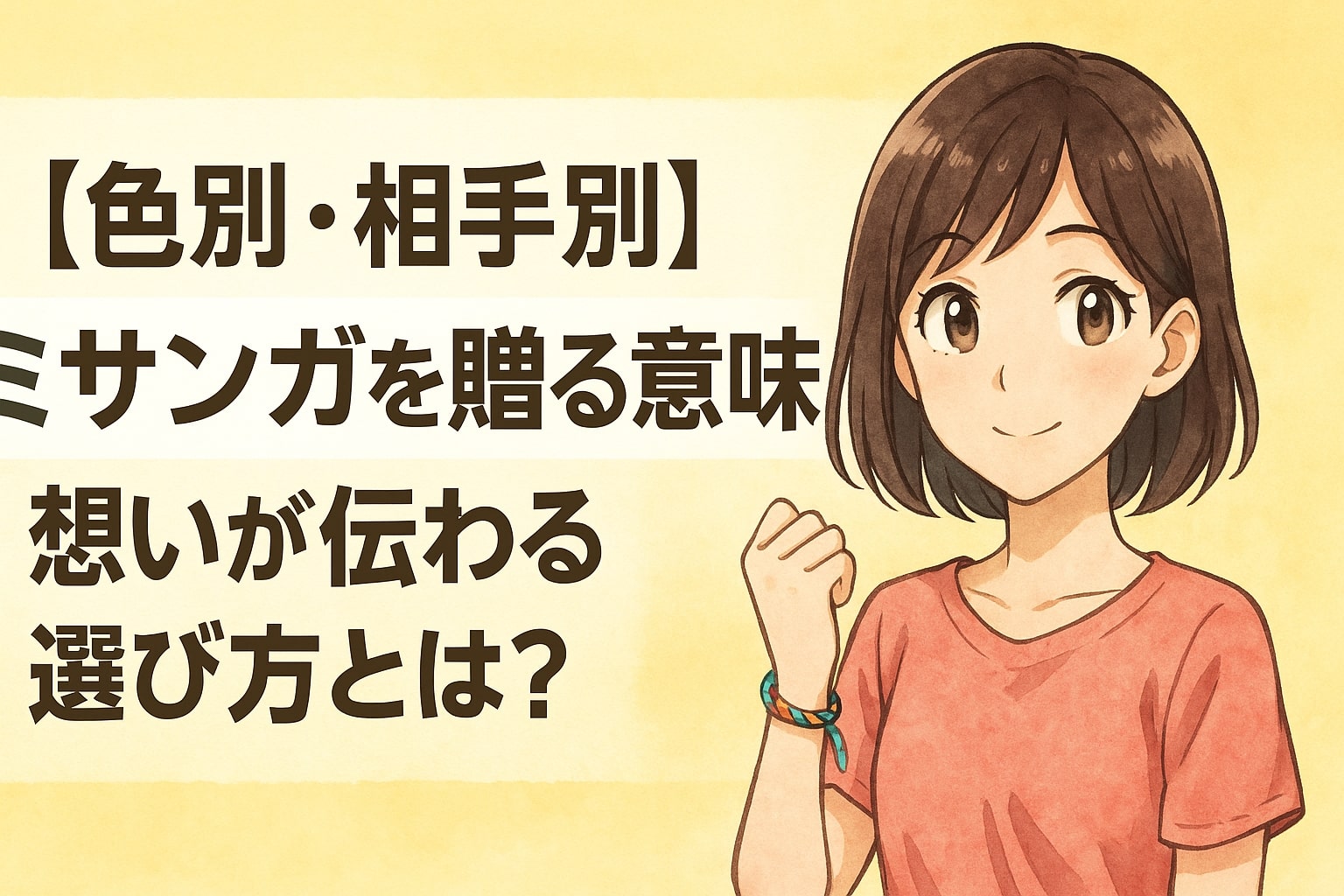 【色別・相手別】ミサンガを贈る意味7選!想いが伝わる選び方とは? 公開日:2025年8月15日 その他 プレゼントにぴったりなミサンガ、その意味について知っていますか? 色やつける場所、贈る相手によって、ミサンガにはたくさんの想いが込められているんです。 でも、「プレゼントとして渡すときってどんな意味があるの?」「色やつけ […] 続きを読む